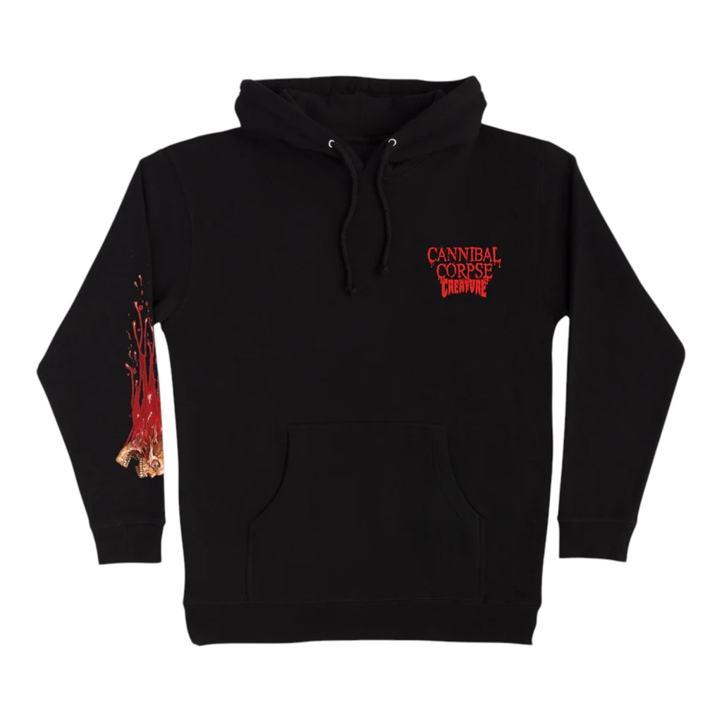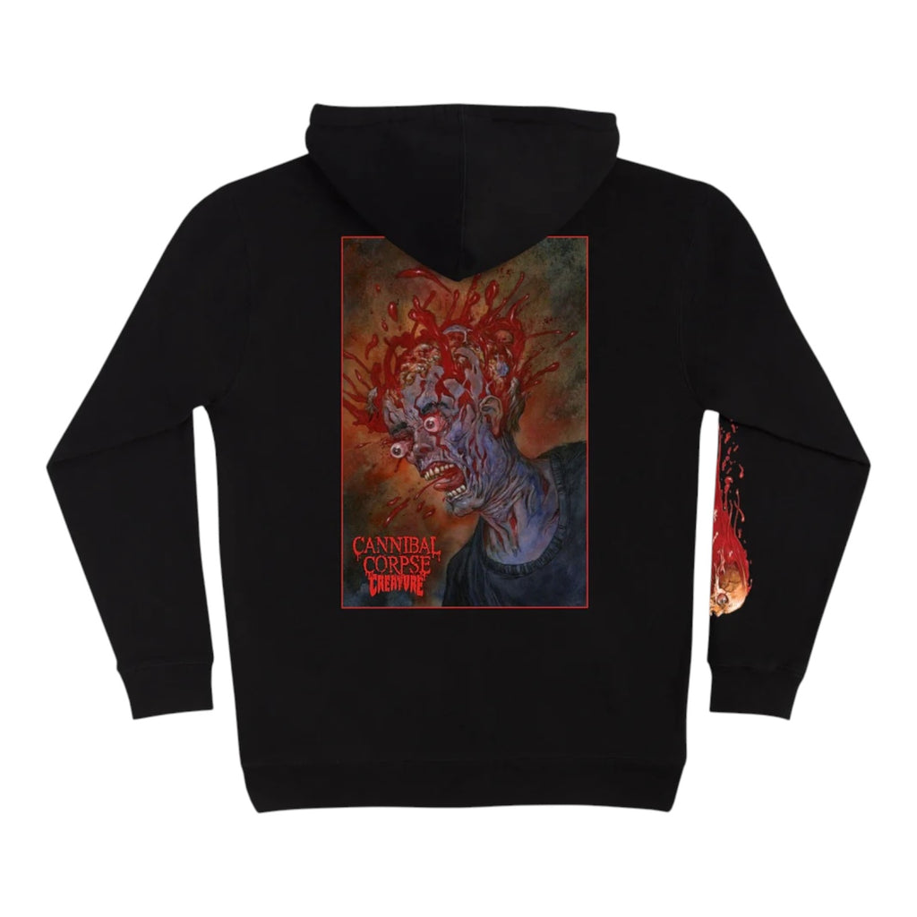 The Creature Cannibal Corpse men's regular fit, heavyweight fleece, hooded pullover sweatshirt features small front, large back and sleeves Creature Cannibal Corpse artwork printed in soft hand ink.
