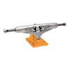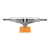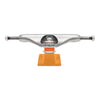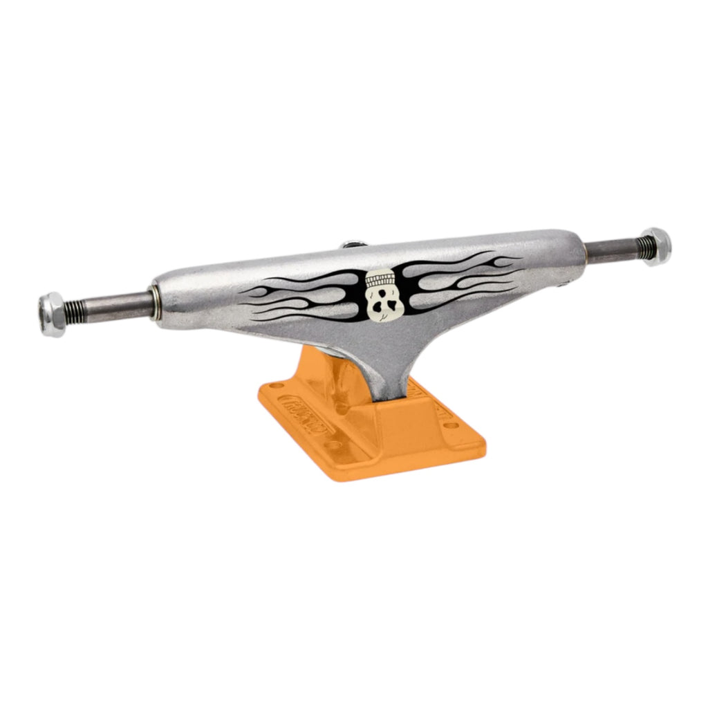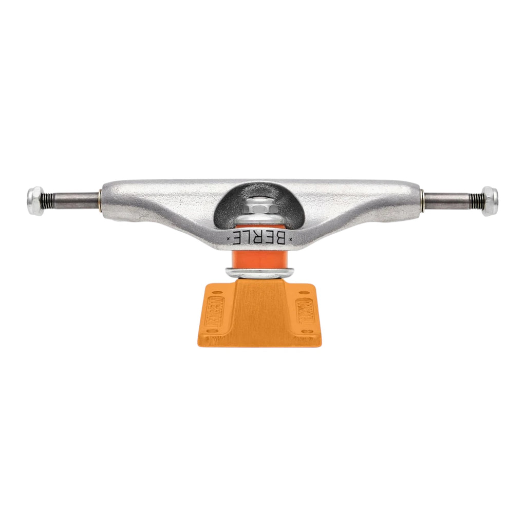 Independent Truck Company Elijah Berle Skull Pro Stage 11 trucks featuring pad printed art by Elijah, pad printed BERLE on yoke, with polished silver hanger, flat orange baseplate, orange cushions, and silver hardware.