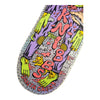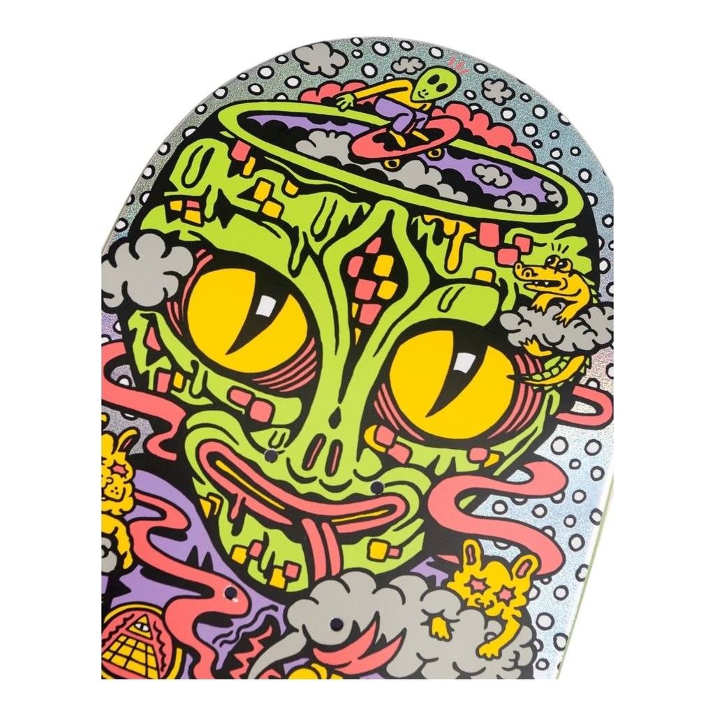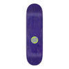 The Santa Cruz Skateboards Knibbs Reptilian Pro 7 ply deck features Jereme Knibbs' 8.5" shape, 14" wheelbase, Knibbs Reptilian artwork printed over silver quicksand foil deck bottom and Santa Cruz Classic Dot art on purple stain deck top.