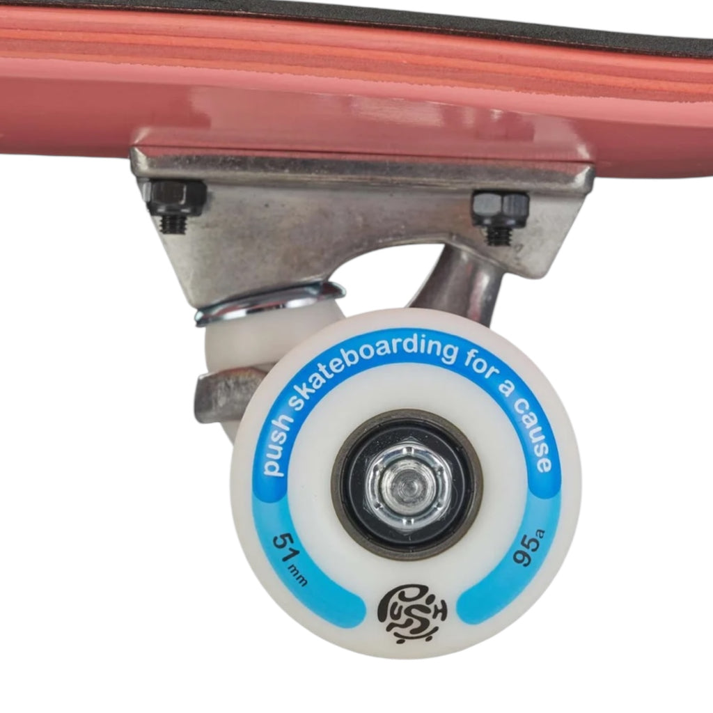 Take your first push with the Push Peak Over Soft Top 1st Push Complete 7.0 x 29.2. This complete comes pre-assembled and ready to skate! You get a pro quality 7-ply maple deck, Cannon trucks, 51mm wheels and shielded bearings.