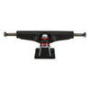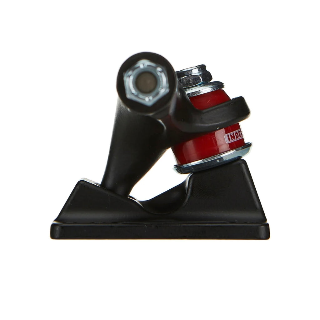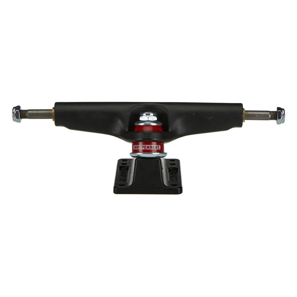 Independent Truck Company Stage 4 black featuring flat black powder coated hanger and baseplate, red Original Cushions, and silver hardware.