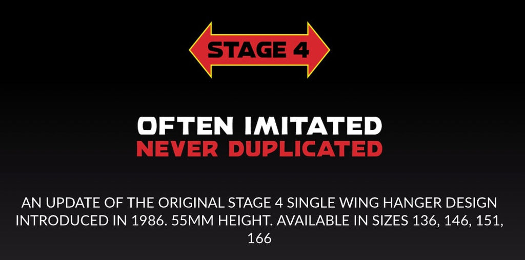 An update of the original Stage 4, single wing hanger design introduced in 1986.With tried and true, classic Indy geometry - Stage 4s are super quick and responsive. Fitted with perfectly sized, original cushions for superior stability, rebound, and snap.