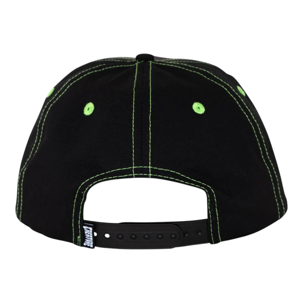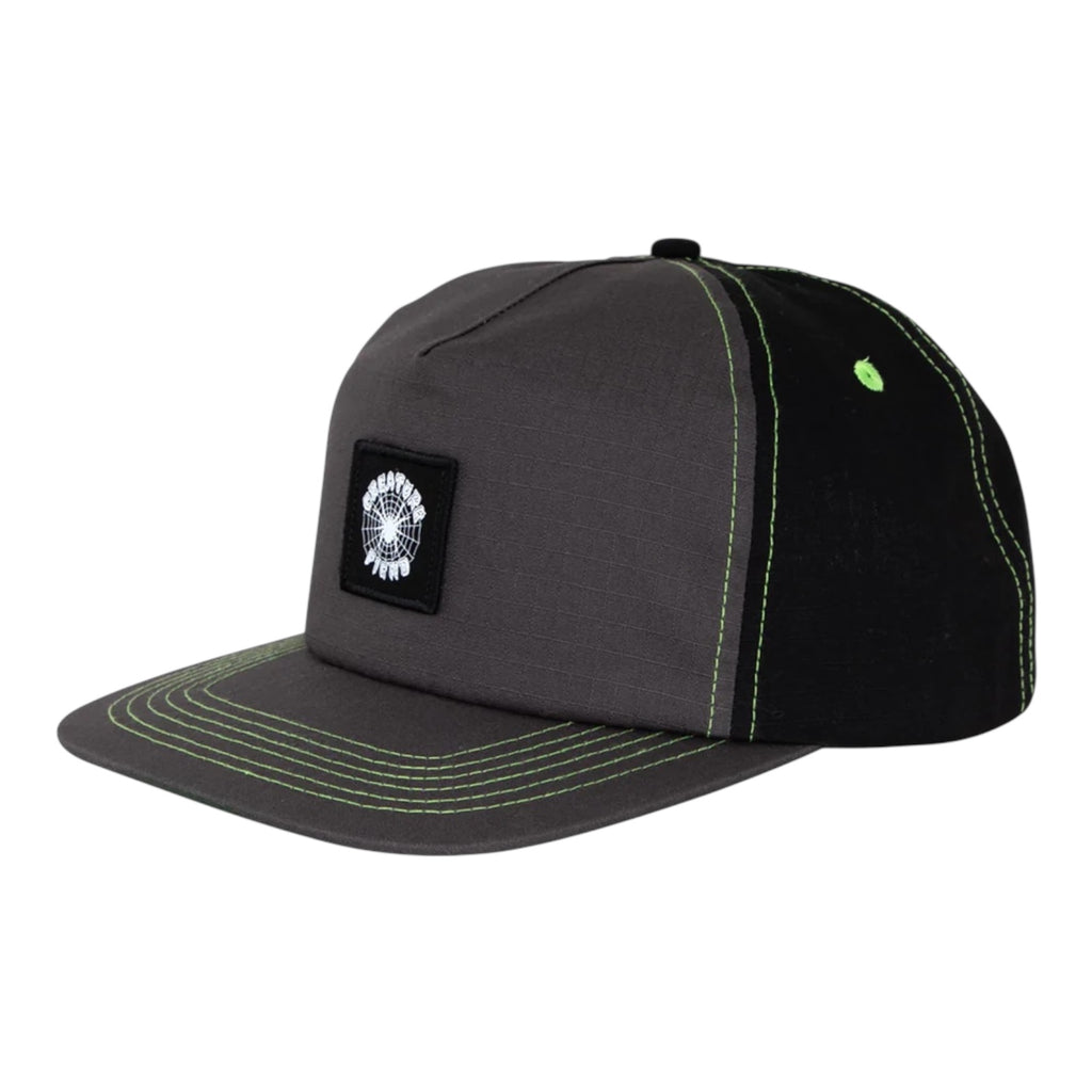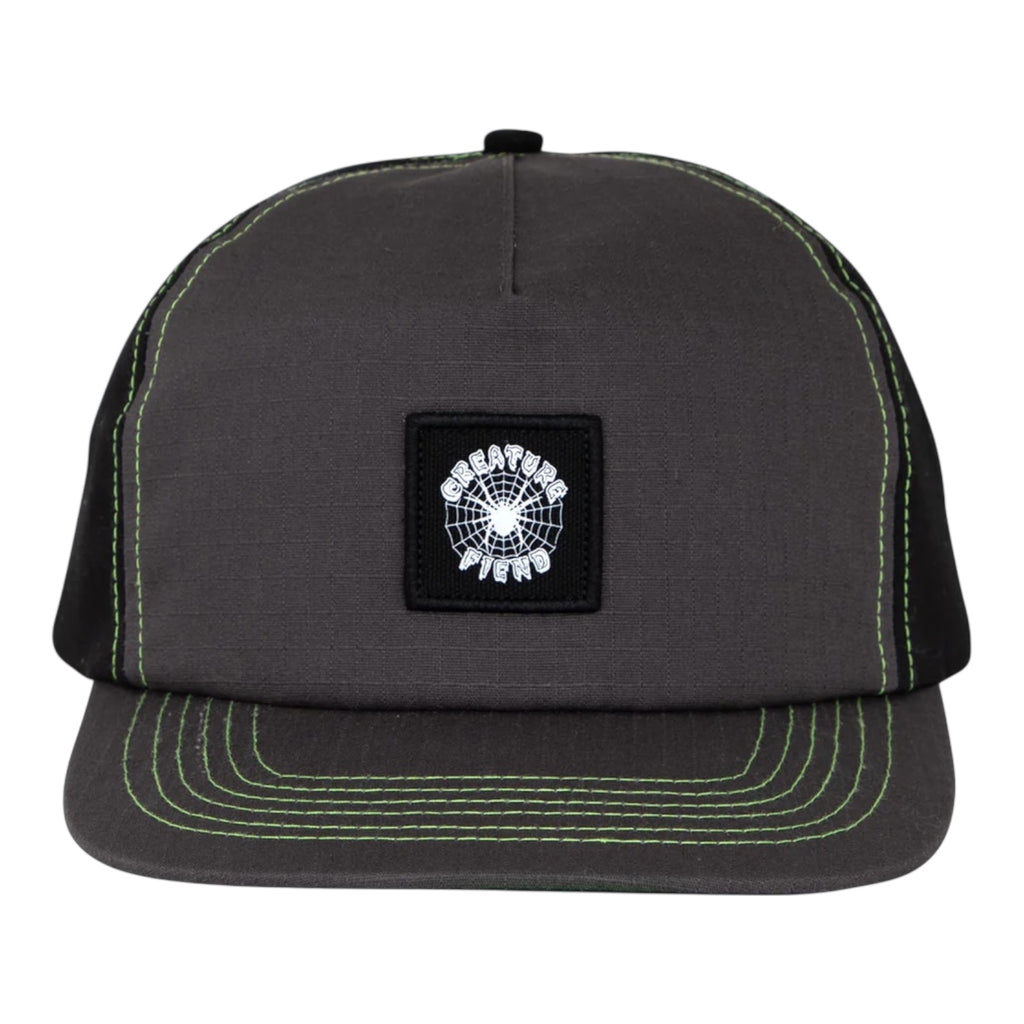 The Creature Web low-profile fit, 5 panel unstructured snapback hat features Creature Web screen printed canvas patch, mesh stay, snap closure and loop label at rear snapback adjuster.