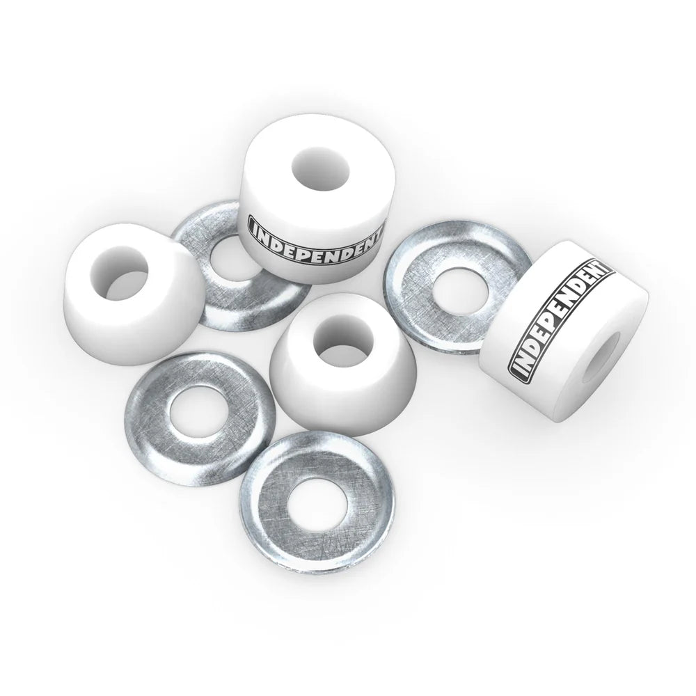 Independent Original Cushions feature custom formulated ultra high rebound Genuine Parts urethane for superior stability and are sized perfectly to fit Independent Stages 1 through 7. Package comes with 2 top & 2 bottom cushions and cup washers. Available in Super Soft White 88a, Soft Red 90a, Medium Blue 92a, and Hard Black 94a.