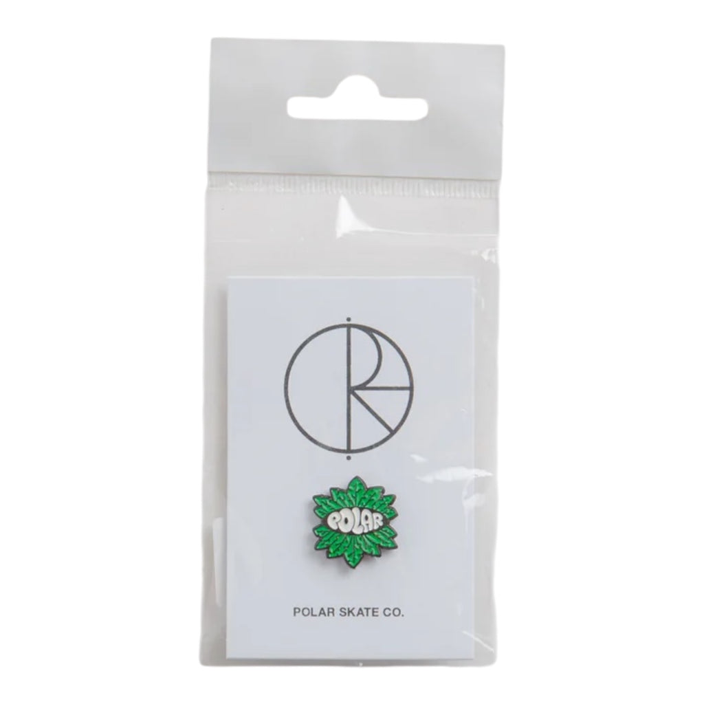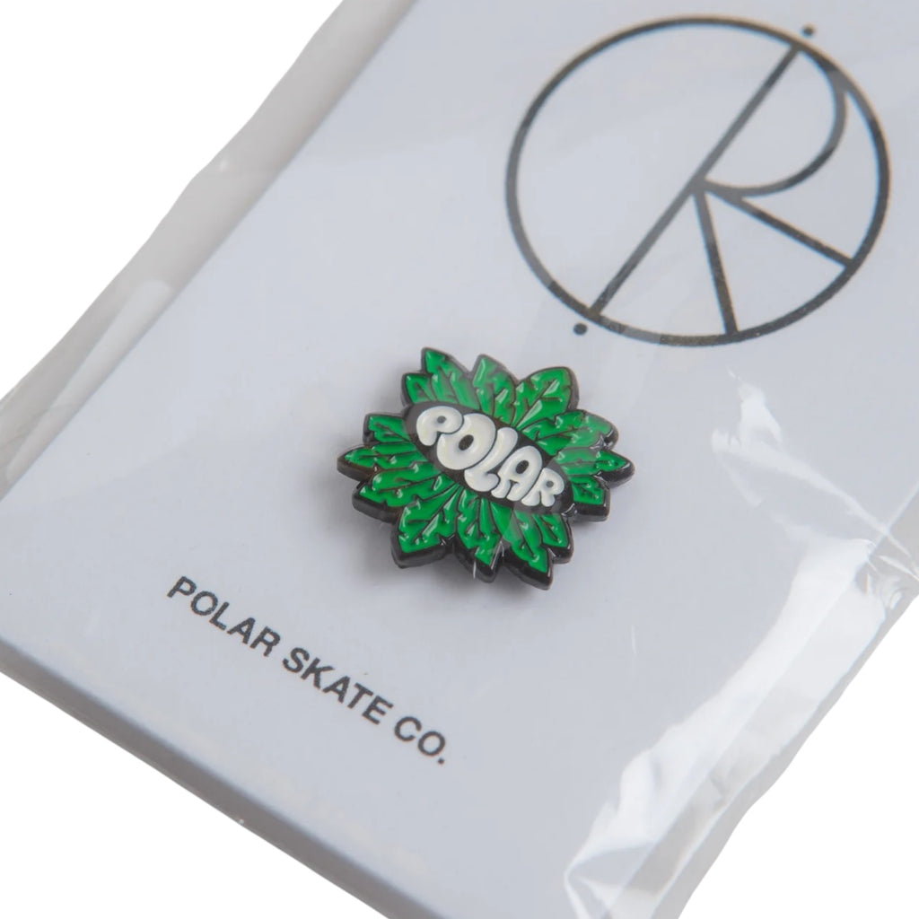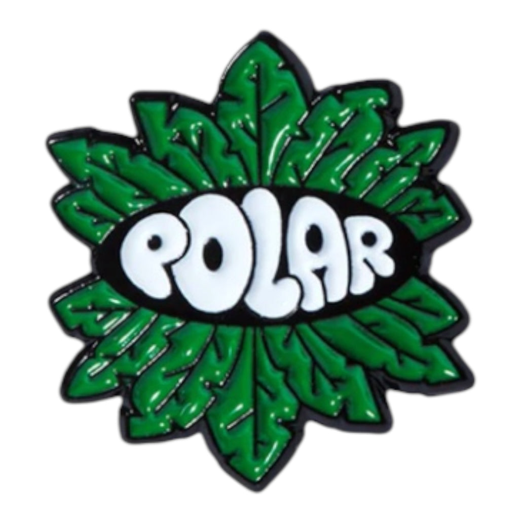 Polar Leaves Pin in Multi. Made from 100% metal, this single sized Polar pin is designed by Jacob Ovgren with an enamel filling and coating. Finished in green, black and white with a secure pin-clasp fastening.
